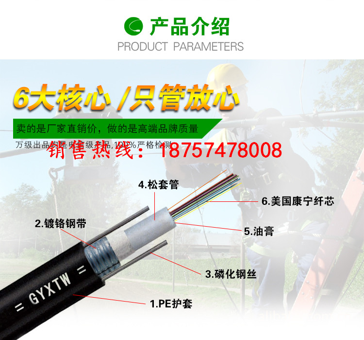 光纜型號(hào):gjyxfch光纜 gjyxch光纜 gjxh光纜 gjxfh光纜 mgtsv光纜 gyxty光纜 gyxtc8s光纜 gyty53光纜 gytc8s光纜 gytc8a光纜 gyfty光纜 adss光纜 gyts光纜 gyta光纜 gyta53光纜 (optical fiber cable)是為了滿(mǎn)足光學(xué)、機(jī)械或環(huán)境的性能規(guī)范而制造的,它是利用置于包覆護(hù)套中的一根或多根光纖作為傳輸媒質(zhì)并可以單獨(dú)或成組使用的通信線(xiàn)纜組件。光纜主要是由光導(dǎo)纖維(細(xì)如頭發(fā)的玻璃絲)和塑料保護(hù)套管及塑料外皮構(gòu)成,光纜內(nèi)沒(méi)有金、銀、銅鋁等金屬,一般無(wú)回收價(jià)值。光纜是一定數(shù)量的光纖按照一定方式組成纜心,外包有護(hù)套,有的還包覆外護(hù)層,用以實(shí)現(xiàn)光信號(hào)傳輸?shù)囊环N通信線(xiàn)路。 即:由光纖(光傳輸載體)經(jīng)過(guò)一定的工藝而形成的線(xiàn)纜。光纜的基本結(jié)構(gòu)一般是由纜芯、加強(qiáng)鋼絲、填充物和護(hù)套等幾部分組成,另外根據(jù)需要還有防水層、緩沖層、絕緣金屬導(dǎo)線(xiàn)等構(gòu)件。