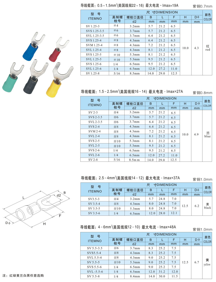 叉形預絕緣端子,叉口線耳鼻子,本系列預絕緣端頭適用于連接導線為0.5-6平方毫米范圍,交流額定工作頻率為50hz,額定電壓為600v,