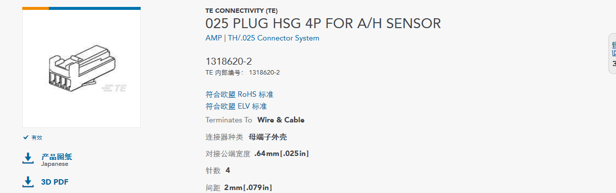 連接器護(hù)套4p泰科料號1318620-2母端子外殼電氣特性