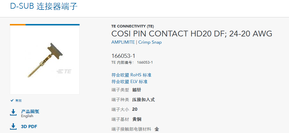 d-sub 連接器端子泰科料號(hào)166053-1鍍金插針連接器簡(jiǎn)介