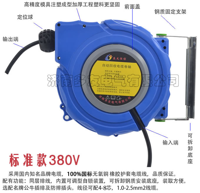 本產(chǎn)品自動(dòng)電纜卷盤采用質(zhì)量上乘的abs工程塑料和高品質(zhì)的零部件制成,超精細(xì)精工磨具鑄造而成,內(nèi)有自動(dòng)排線結(jié)構(gòu)和自動(dòng)鎖定裝置,可實(shí)現(xiàn)自由拉伸、自動(dòng)回縮線纜、自動(dòng)線長(zhǎng)定位,控制電纜拉出和回收的長(zhǎng)度。自由伸縮設(shè)計(jì)實(shí)現(xiàn)占用空間少的目的,使用方便快捷,使場(chǎng)地更整潔有序,采用高品質(zhì)橡膠護(hù)套電纜,延長(zhǎng)設(shè)備使用壽命。本產(chǎn)品可靈活的固定在墻壁或天花板上,不受工作空間的限制,拉伸長(zhǎng)度在規(guī)定的范圍內(nèi)自由調(diào)節(jié)。固定后盤體可左右180度擺動(dòng),工作范圍大,適用于:汽修汽保/汽車美容,生產(chǎn)流水線,電子廠,電廠,特種車輛制造裝備車間、機(jī)電維修,各汽車4s品牌店等多場(chǎng)所的使用。