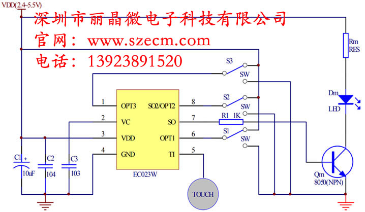 ec023w是一款用于led燈光亮度調(diào)節(jié)及開關(guān)控制的單通道觸摸芯片。使用該芯片可以實現(xiàn)