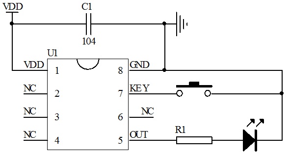 供電方式:dc3.0v。一路按鍵輸入控制,一路led輸出。