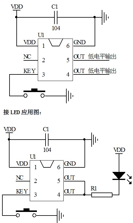cmos 制造工藝,低功耗,內(nèi)置振蕩電阻,一個(gè)按鍵開關(guān)輸入,兩路同步低電平輸出。上電不工作out輸出高電位(高阻態(tài)),短按按鍵開關(guān),out輸出低電平。再短按按鍵,out輸出高電位(高阻態(tài))。