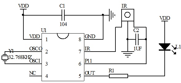 供電方式:dc3v(aa*2)一路紅外遙控輸入控制,一路led輸出。上電工作,蠟燭燈閃法:柔和閃 。有晶振檢測(cè):無晶振或晶振工作不正常時(shí),定時(shí)按鍵模式led無輸出。