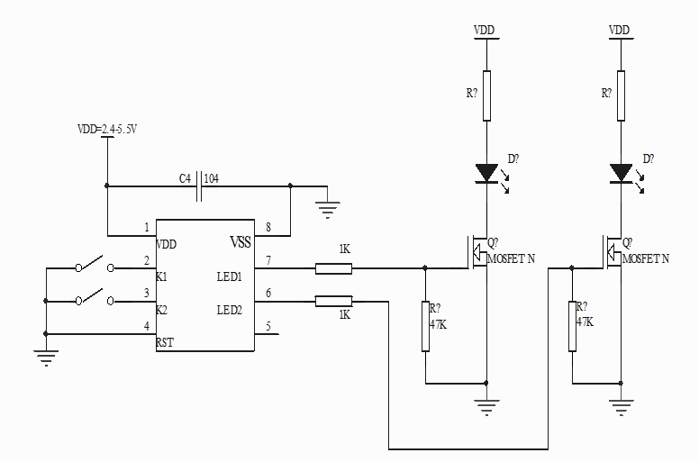 上電不工作,共兩路輸出led1和led2。