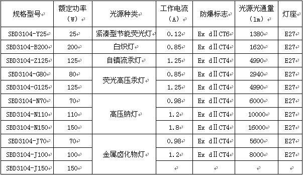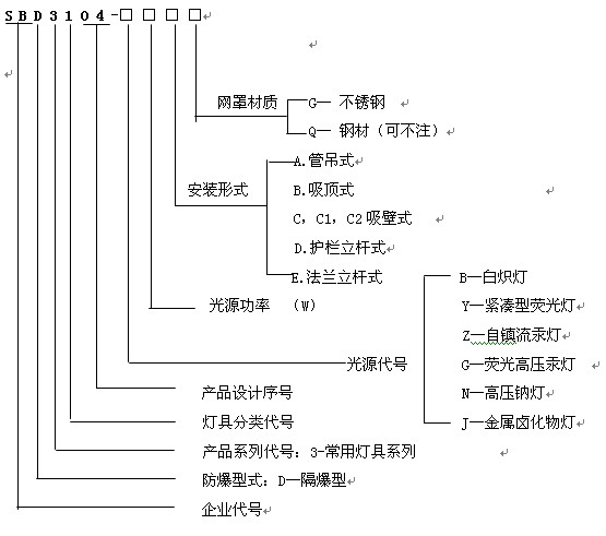 選型舉例:例如sbd3104-n110a表示燈具系列,隔爆型常用燈具系列,光源為110w高壓鈉燈,鋼材表面聚脂噴鍍保護網(wǎng),管吊式安 裝。