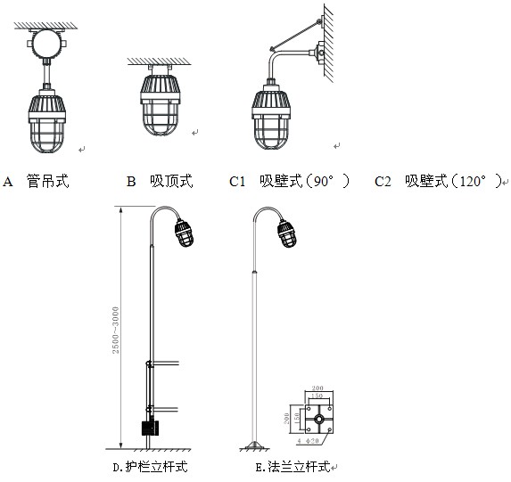 8. 本燈具適用于管吊式、吸頂式、吸壁式、立桿式多樣安 裝方式,(見安 裝示意圖)。