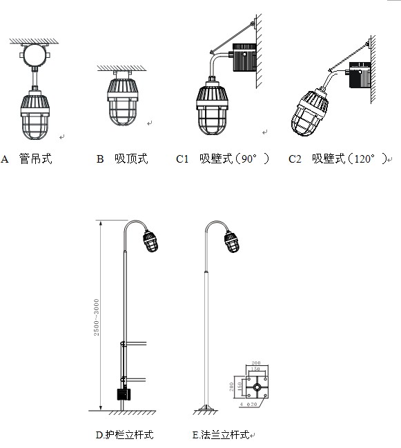 8. 本燈具適用于管吊式、吸頂式、吸壁式、立桿式多樣安 裝方式,(見安 裝示意圖)。