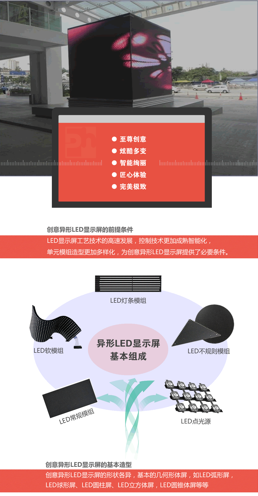 異形led顯示屏的形狀各異,有圓弧、曲面、四方六面體、字母以及其他不規(guī)則的造型,led球形屏、led弧形屏、led圓柱屏、led立方體等在各種應(yīng)用中嶄露頭角,異形led顯示屏還應(yīng)用于各種文藝演出、婚禮秀場(chǎng)、開幕式展演、休閑娛樂(lè)領(lǐng)域。