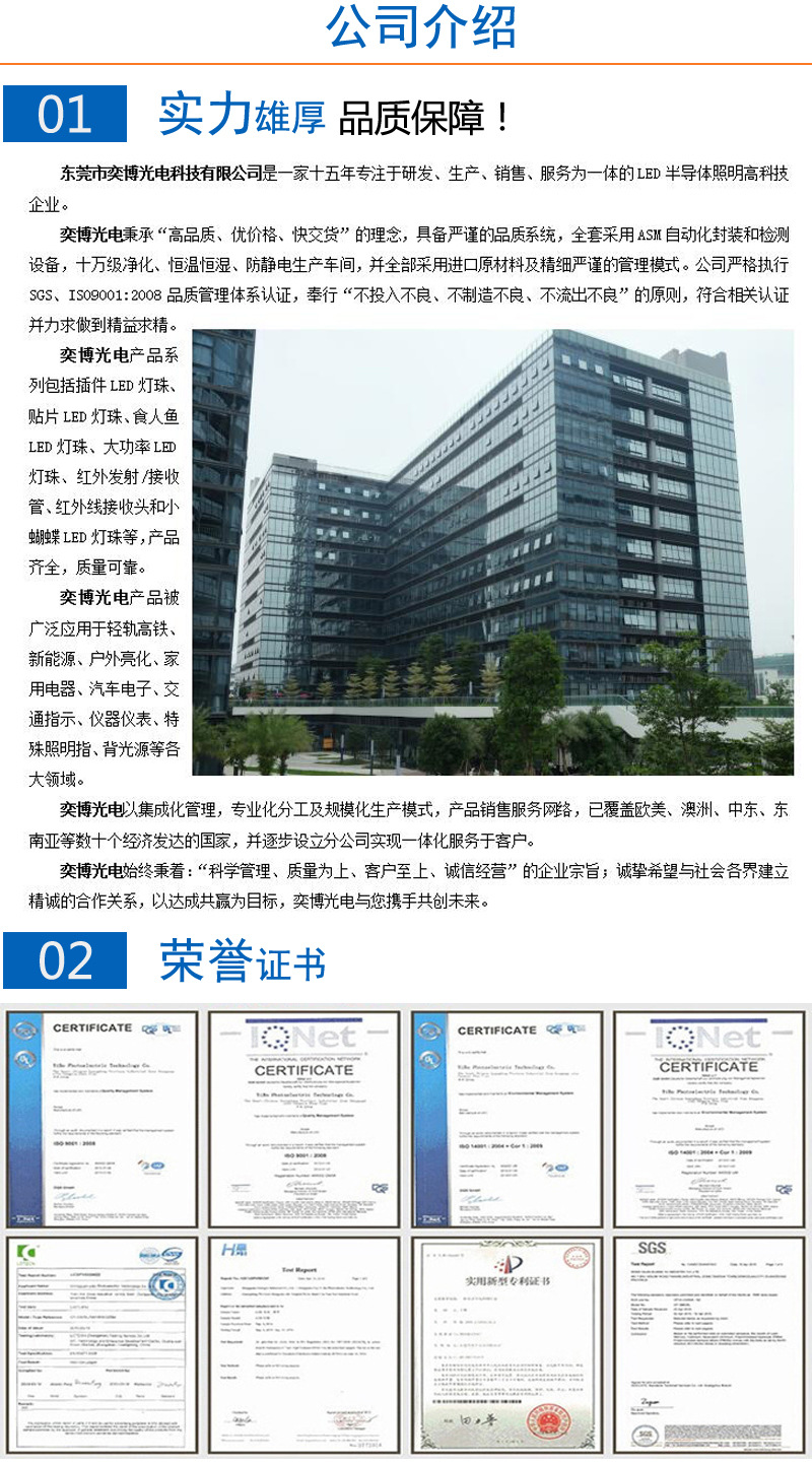 奕博光電秉承“高品質(zhì)、優(yōu)價(jià)格、快交貨”的理念,具備嚴(yán)謹(jǐn)?shù)钠焚|(zhì)系統(tǒng),全套采用ASM自動(dòng)化封裝和檢測(cè)設(shè)備,十萬(wàn)級(jí)凈化、恒溫恒濕、防靜電生產(chǎn)車(chē)間,并全部采用進(jìn)口原材料及精細(xì)嚴(yán)謹(jǐn)?shù)墓芾砟J。公司?yán)格執(zhí)行SGS、ISO9001:2008 品質(zhì)管理體系認(rèn)證,奉行“不投入不良、不制造不良、不流出不良”的原則...