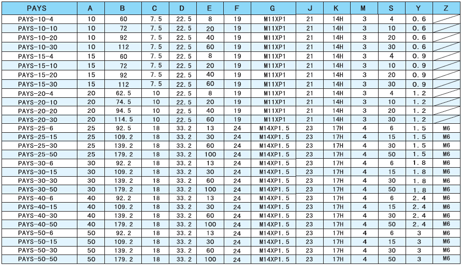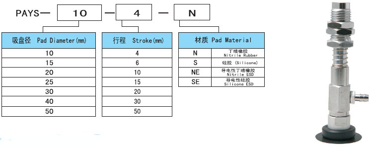 pays橫向接管附緩沖薄型吸盤規(guī)格尺寸圖表: