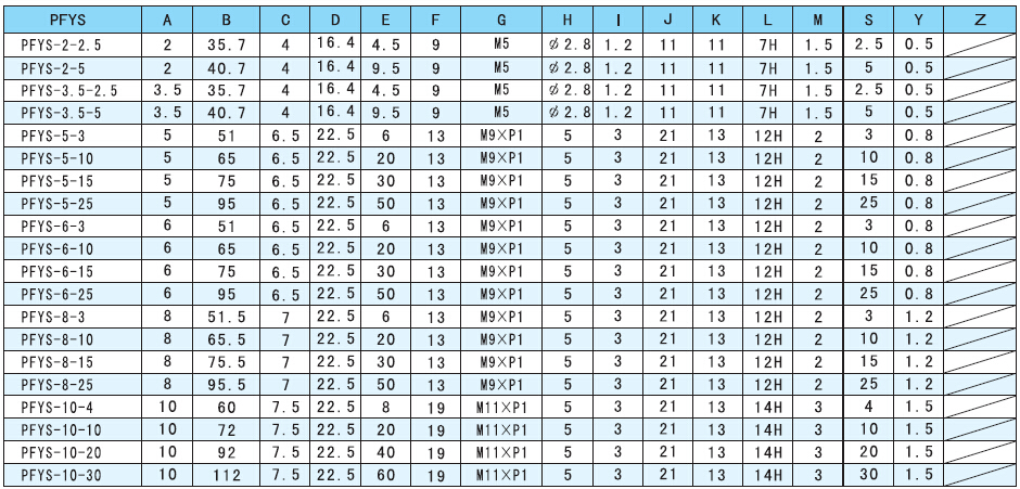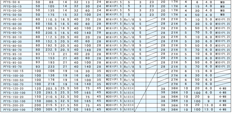pfys橫向接管附緩沖標準吸盤規(guī)格尺寸圖表:
