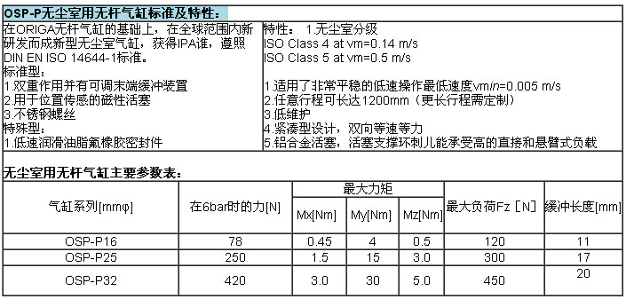 osp-p無塵室用無桿氣缸標(biāo)準(zhǔn)及特性: