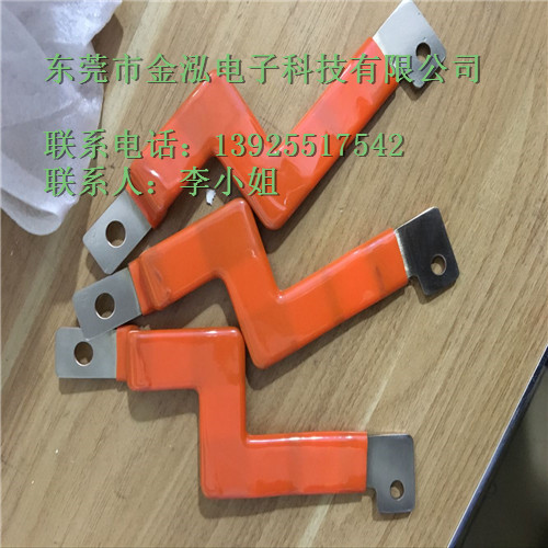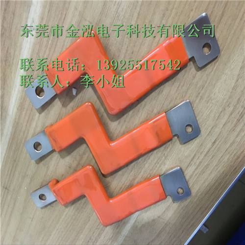 材料:采用優(yōu)質(zhì)0.05~0.3mm厚銅箔,常規(guī)使用0.1厚t2紫銅箔,上下表面貼0.1厚純鎳片,或0.1厚鍍鎳銅片,將疊片部分壓在一起,兩端或者打孔部分采用高分子擴(kuò)散焊,通過大電流加熱壓焊成型。中間套熱縮管保護(hù),大尺寸異形產(chǎn)品,中間采用浸塑工藝。
