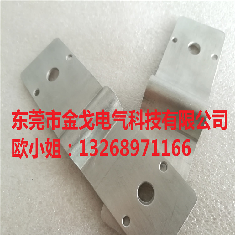 鋁箔軟連接采用優(yōu)質(zhì)0.05~0.3mm厚鋁箔,常規(guī)使用0.1厚鋁箔,上下表面貼0.1厚純鎳片,或0.1厚鍍鎳銅片,將疊片部分壓在一起,兩端或者打孔部分采用高分子擴散焊,通過大電流加熱壓焊成型。中間套熱縮管保護,大尺寸異形產(chǎn)品,中間采用浸塑工藝