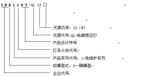 選型舉例:例如 sbd1107-ql23d表示隔爆型免維護系列防爆吸頂燈具,電磁感應(yīng)燈光源,功率23w,吸頂式安 裝。