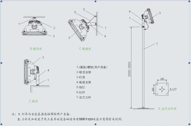 4. 燈具為兩腔設(shè)計(jì),光源腔與電器腔獨(dú)立分開。燈具外形分平臺(tái)式(d型)與管吊式(a型),平臺(tái)式適用于吸壁式安 裝、護(hù)欄立桿式安 裝、法蘭立桿式安 裝。管吊式適用于管吊式安 裝、吸頂安 裝和吸壁安 裝。(見(jiàn)安 裝示意圖)。