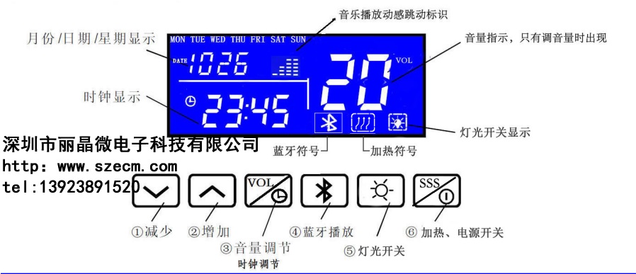 時鐘調(diào)節(jié):長按③鍵3秒則關閉藍牙播放功能可以調(diào)整日期和時間,此時時鐘顯示小時的數(shù)字閃爍,在閃爍時可通過按下①鍵或②鍵調(diào)整小時值;調(diào)整完畢后再按③鍵,時鐘顯示分鐘的數(shù)字閃爍,在閃爍時可通過按下①鍵或②鍵調(diào)整分鐘值;再按下③鍵,顯示月份數(shù)字閃爍,在閃爍時通過按下①鍵或②鍵調(diào)整月份,以此類推,后于年份設置完畢后待數(shù)字不再閃爍即完成時鐘設置;(時鐘設置只能在藍牙功能關閉的情況下才能操作)