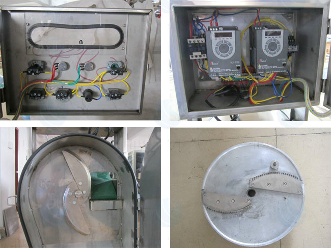 2、葉類蔬菜:由輸送帶輸送原料,轉(zhuǎn)刀速度和皮帶速度分別有變頻器獨立控制,切菜尺寸可以調(diào)節(jié) 1 - 60 mm。