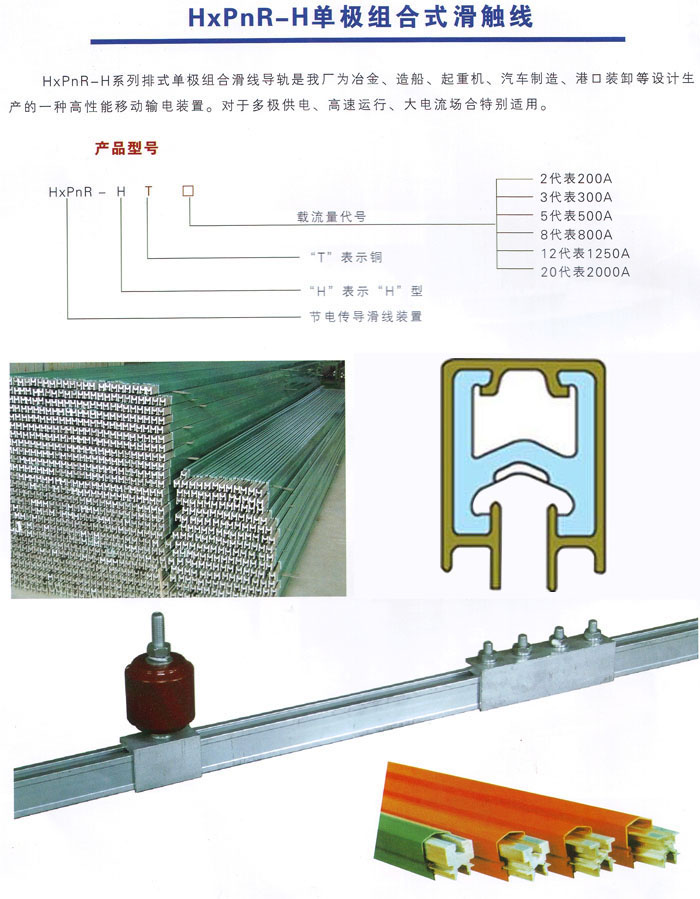 hxpnr- h系列單極安全滑觸線由h型鋁合金本體導(dǎo)軌加壓v型不銹鋼滑接帶、pvc絕緣外殼、外置式集電器以及懸吊、固定等組件組合而成。該產(chǎn)品以其設(shè)計(jì)新穎、結(jié)構(gòu)合理、維護(hù)方便、使用安全等特點(diǎn)被廣泛應(yīng)用于電流較大、使用頻率較高、運(yùn)行速度快和環(huán)境較差的場(chǎng)合。