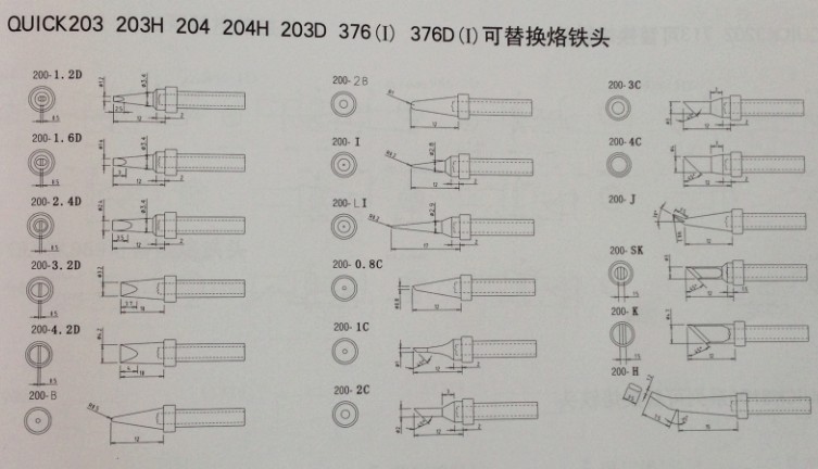 2..200烙鐵頭(200烙鐵咀)主要 適用于高頻渦流發(fā)熱原理無鉛焊臺(tái)。適用于以下焊臺(tái):快克quick501、快克quick502、快克quick503、快克quick504、快克quick203、快克quick203h、快克quick204、快克quick204h、tpk200、tpk300、et2000、et2100、et2200等手柄的烙鐵頭;