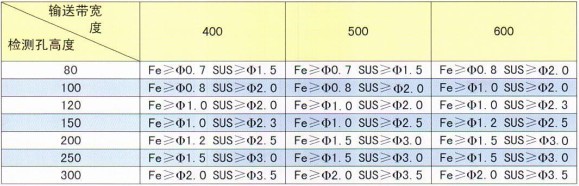 雙探頭金屬檢測機(jī)檢測靈敏度(單位mm):