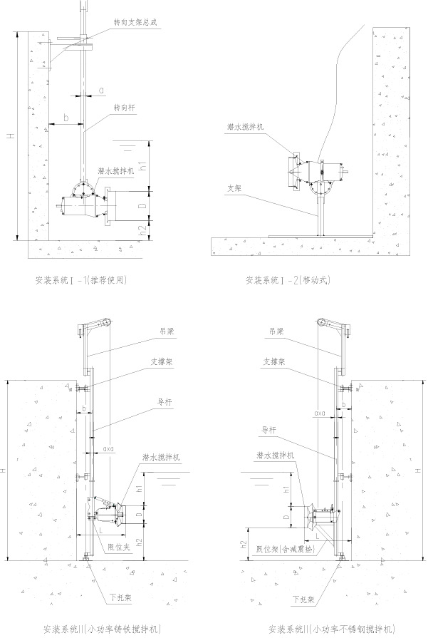 潛水攪拌機必需完全潛入水中工作;不能在易燃易爆或有強腐蝕性液體的環(huán)境中工作;鋼膨脹螺栓須按要求固定,安裝完畢后,必須將電纜拉緊固定好.