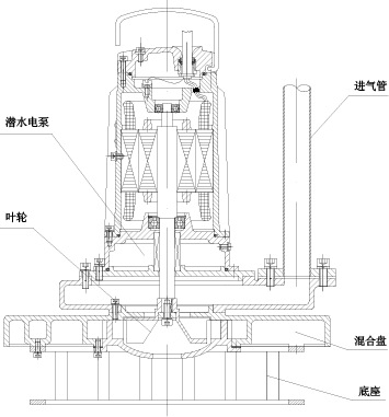qxb 型離心式潛水曝氣機為直聯(lián)式結構。旋轉的葉輪在水中產(chǎn)生一個離心力,通過離心力在葉輪周圍形成一個負壓區(qū),空氣通過進氣管被吸入,被吸入的空氣和水在混合盤內混合,隨后這種良好的均勻的混合物自動從排出口排出。