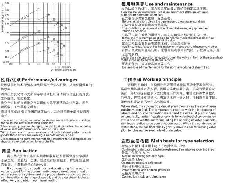 浮球式疏水閥利用雙閥孔,使閥蕊在開閥時壓力相對減少,從而獲得大排量。工作時浮球隨閥腔內(nèi)液體位的變化而上下浮動,帶動杠桿打開或關閉閥座。由于閥座孔在凝結水水位以下,形成水封,水、汽自然分離,達到無蒸汽泄漏。背壓率為80%,小工作壓力0.01mpa,從0.01mpa至使用壓力范圍之內(nèi)不受溫度和工作壓力波動的影響,連續(xù)排水。能排飽和溫度凝結水,小過冷度為0℃,加熱設備里不存水,能使加熱設備達到換熱效率。