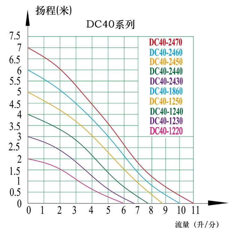 選型注意事項(xiàng) | 如果選用調(diào)速型號(hào)則在后面加上字母a,例如dc40-2470a。 選型時(shí)務(wù)必給出使用環(huán)境:如連續(xù)工作時(shí)間、水溫、介質(zhì)等,水泵功率超過(guò)24w就不適合長(zhǎng)期在60度以上水溫連續(xù)工作,請(qǐng)務(wù)必與專業(yè)人員溝通以便選擇最合適的水泵型號(hào)! 上述電流為水泵的開(kāi)口電流即當(dāng)水泵直接放入水中不接任何系統(tǒng)時(shí)的電流,也為水泵最大電流,當(dāng)水泵接上系統(tǒng)之后水泵的工作電流會(huì)降低到最大負(fù)載電流的70%-85%。 水泵的揚(yáng)程為最大送水高度,即到達(dá)最大揚(yáng)程點(diǎn)的流量為零。 水泵的流量為水平流量,即水平抽水的流量。 |