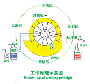 吸漿區(qū):工作時浸沒在料漿的過濾板在毛細作用下結(jié)合真空壓力,表面吸附成一層濾餅,濾液通過濾板進分配閥至排液罐。淋洗區(qū):濾餅轉(zhuǎn)出料漿斗后,對濾餅進行噴淋洗滌。