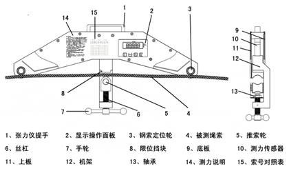 1. 按鍵從左至右依次為“on/off”、“+”、“-”、“enter/zero”;上部lcd顯示的五位數(shù)字為索拉力,單位為、旋緊手輪至鋼索頂?shù)较尬患达@示鋼索拉力。