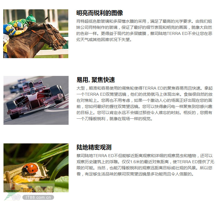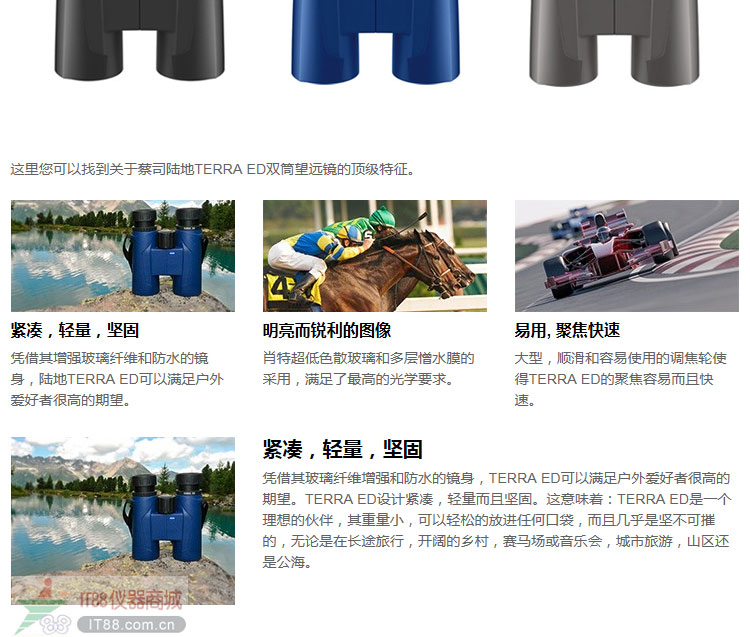 新的蔡司陸地terra ed 8*42和10*42是您近距離體驗生命里最迷人時刻的理想伙伴,無論何時何地。其功能迷人,設計現代,而且有著690克輕巧的重量,得益于其纖細的外型,使得望遠鏡緊湊而且堅固。肖特超低色散玻璃和憎水膜的使用,保證了最微小細節(jié)的優(yōu)異體現。事實上,terra ed的防水和充氮進一步強調了其戶外的目的。terra ed有著一個易于使用而且快速的對焦機構,并且最近對焦距離僅僅1.6米。terra ed可以隨時帶上就走,無論是激動人心的體育比賽,重大場合或音樂會,迷人的旅行,登山或海濱散步。蔡司terra ed是有著生活品味的雙筒望遠鏡,在任何地形都值得信任。
