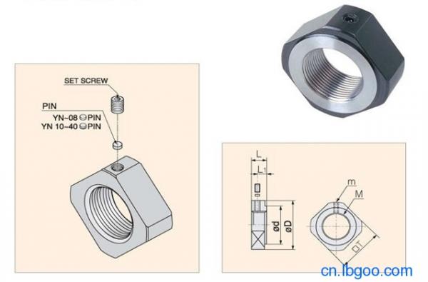 鎖緊螺母是一種廣泛應(yīng)用于機(jī)械等行業(yè)的常見螺母,滾珠絲杠用鎖緊螺帽可以十分容易而精確地緊固絲桿軸和軸承。采用由內(nèi)六角頭固定螺釘和安 裝片構(gòu)成的防松動機(jī)構(gòu),可以防止鎖緊螺帽松動,確保連接牢固。