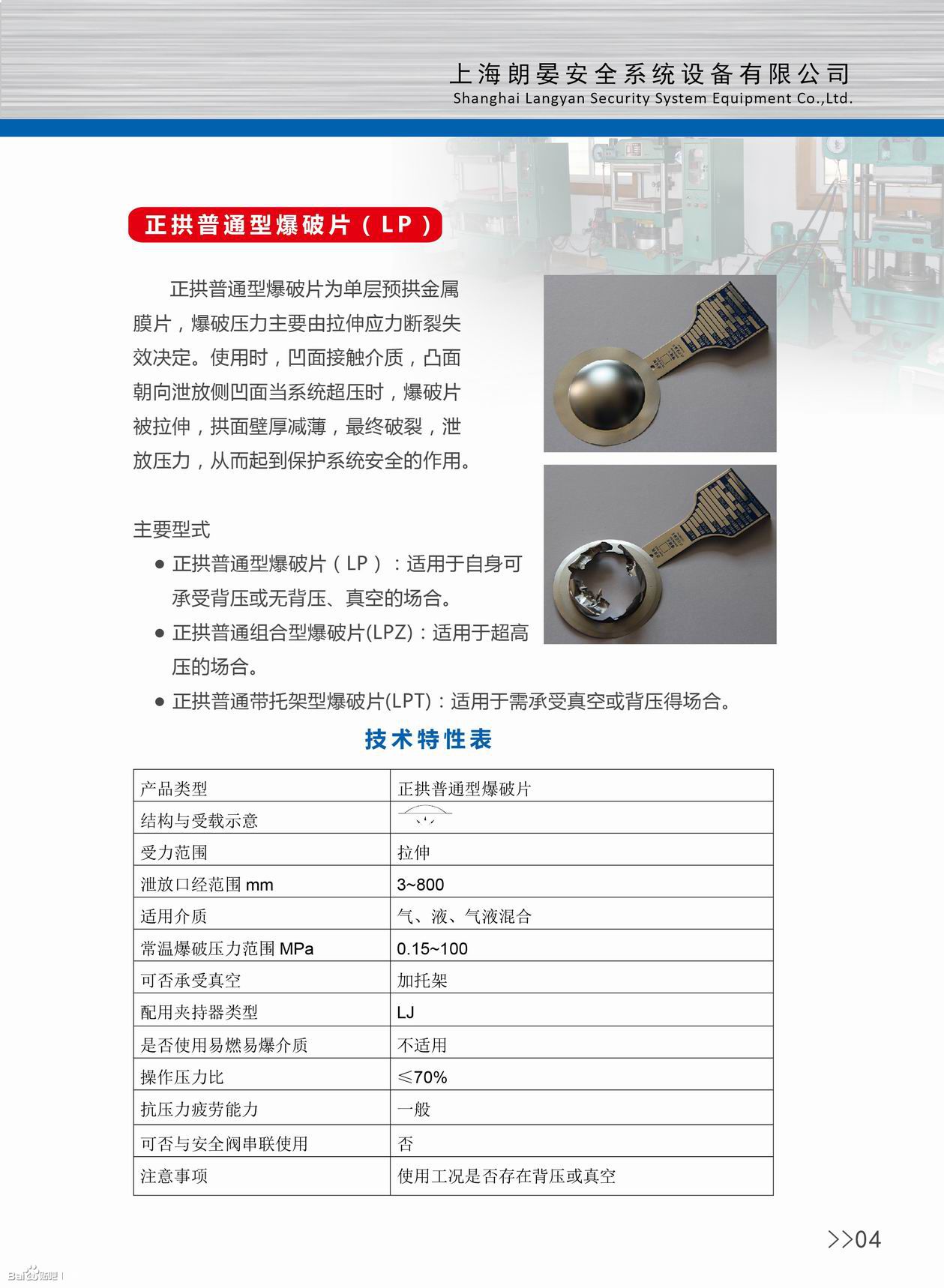 按照結構型式來分類,爆破片主要有三種,即平板型、正拱型和反拱型。平板型爆破片的綜合性能較差,主要用于低壓和超低壓工況,尤其是大型料倉。正拱型和反拱型的應用場合較多。對于傳統(tǒng)的正拱型爆破片,其工作原理是利用材料的拉伸強度來控制爆破壓力,爆破片的拱出方向與壓力作用方向一致。在使用中發(fā)現,所有的正拱型爆破片都存在相同的局限:爆破時,爆破片碎片會進入泄放管道;由于爆破片的中心厚度被有意減弱,易于因疲勞而提前爆破;操作壓力不能超過爆破片最小爆破壓力的65%。由此導致了反拱型爆破片的出現。這種爆破片利用材料的抗壓強度來控制其爆破壓力,較之傳統(tǒng)的正拱型爆破片,其具有抗疲勞性能優(yōu)良、爆破時不產生碎片且操作壓力可達其最小爆破壓力90%以上的優(yōu)點。細分之下,反拱型爆破片包括反拱刻槽型、反拱腭齒型以及反拱刀架型等。