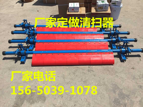 頭道清掃器-頭部清掃器又叫第一道清掃器,h型清掃器安 裝于頭部滾筒處,刮板材料采用超耐磨聚氨酯,通過調(diào)整彈簧改變刮板對輸送帶的壓力,達(dá)到徹底清掃物料的效果。