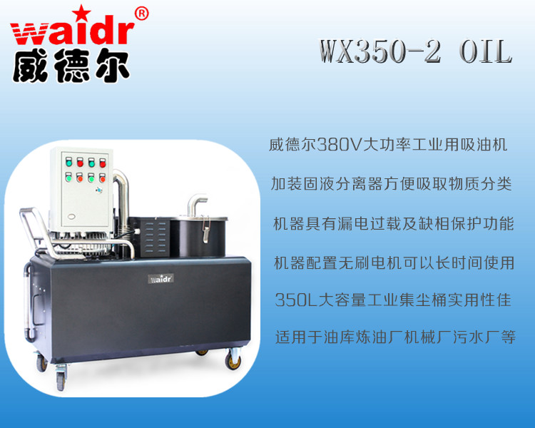 3.wx350-2 oil工業(yè)吸油機,它設(shè)計緊湊,外觀優(yōu)美,歐式工藝制作,用的pu工業(yè)腳輪,減震,耐磨,耐油性好,移動方便靈活。
