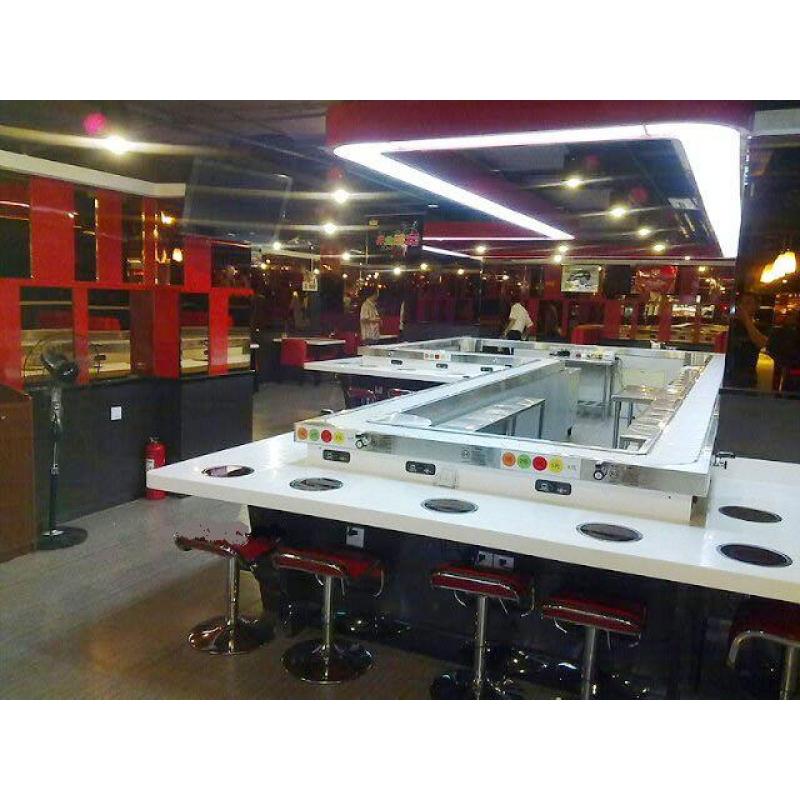 線速2-8米/分鐘 可調(diào)。壽司線,回轉(zhuǎn)壽司線,回轉(zhuǎn)火鍋線專為大中小型餐飲連鎖企業(yè)量身定做,適應(yīng)了飲食界推陳出新,適應(yīng)了現(xiàn)代人對(duì)飲食新奇的追求,