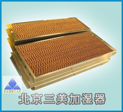 水箱中的水輸送到加濕器頂部的淋水器,水均勻地淋到濕膜的頂部,淋水器確保水均勻分配到濕膜材料上,水在重力作用下沿濕膜材料向下浸透,淋濕濕膜內(nèi)部的所有層面,同時(shí)被濕膜材料吸收,形成均勻的水膜.當(dāng)干燥的風(fēng)通過濕膜材料時(shí),干燥的空氣和濕潤(rùn)的濕膜表面有較大面積的接觸,水份充分吸收空氣的熱量而汽化、蒸發(fā),從而達(dá)到對(duì)空氣加濕的目的。在這一加濕過程中,空氣的濕度增加,溫度下降,但空氣的焓值不變。