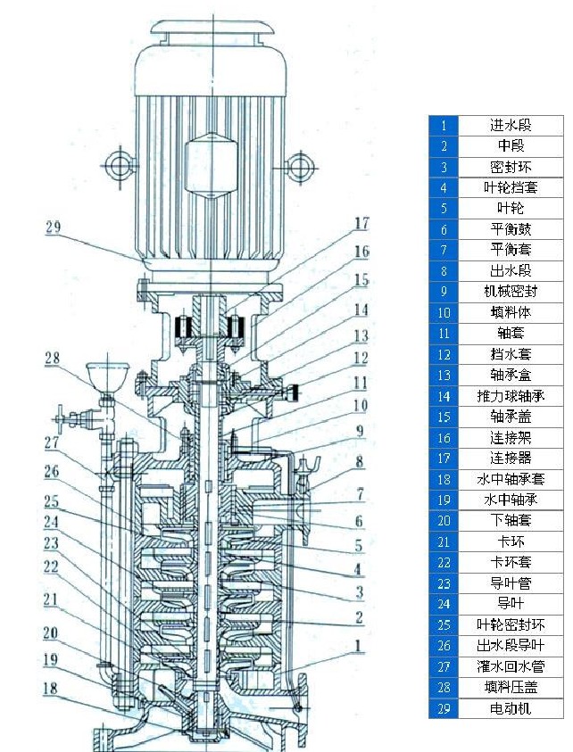 1,dl立式多級(jí)離心泵是采用國(guó)家推薦使用的高效節(jié)能產(chǎn)品is型泵的水力模型,為立式多級(jí)多節(jié)段式結(jié)構(gòu)。螺桿把進(jìn)水段、中段、出水段夾緊聯(lián)成一體。水泵每一級(jí)裝一個(gè)葉輪、一個(gè)導(dǎo)水葉。