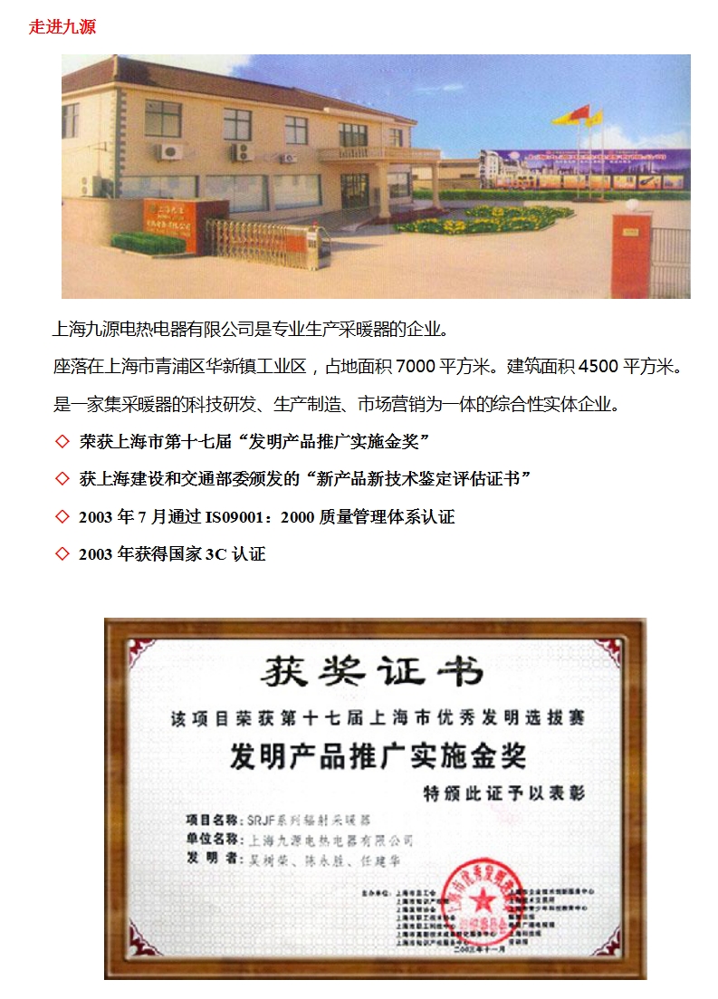 上海九源電熱電器有限公司是專業(yè)生產(chǎn)采暖器的企業(yè)。座落在上海市青浦區(qū)華新鎮(zhèn)工業(yè)區(qū),占地面積7000平方米,建筑面積4500平方米。是一家集采暖器的科技研發(fā)、生產(chǎn)制造、市場營銷為一體的綜合性實體企業(yè)。上海九源電熱電器有限公司成立多年已形成符合現(xiàn)代化企業(yè)管理要求的管理體制,建立了質(zhì)量管理體系。上海九源電熱電器有限公司產(chǎn)品在電輻射供暖行業(yè)中始終處于領(lǐng)先地位。并榮獲上海市第十七屆“發(fā)明產(chǎn)品推廣實施金獎”,相...
