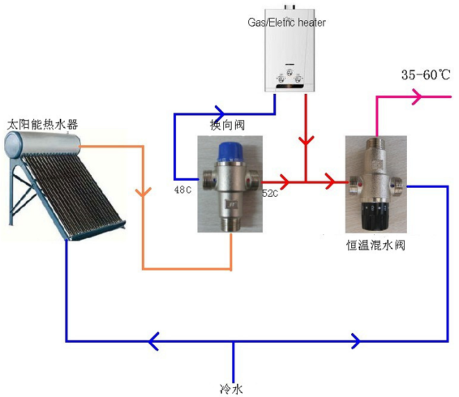 工作原理:換向閥工作原理,溫度低于48度,僅從冷水口出水,進入燃氣/電熱水器,進行二次加熱。當溫度高于52度,僅從熱水口出水,供最終用戶使用。當溫度介于48與52度之間,冷水兩端均有出水。
