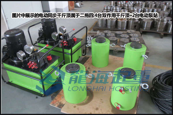 電動同步液壓千斤頂:由一臺或者多臺液壓千斤頂+泵站,組成一拖四、一拖六、一拖八等