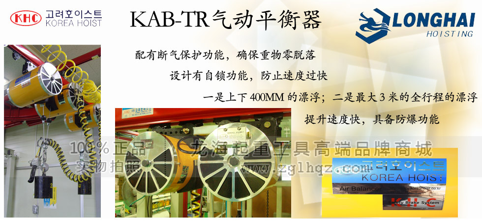 1. 韓國(guó)khc氣動(dòng)平衡器主要有kab型和kab-tr型產(chǎn)品,其可配合多種非標(biāo)鋏具使用,可搭配懸臂吊或者導(dǎo)軌來(lái)安 裝使用進(jìn)行移動(dòng)作業(yè);