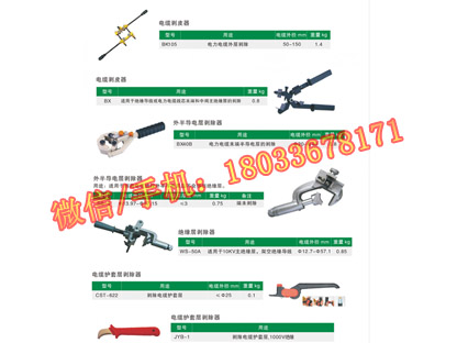 河北霸州電力工具廠最具實(shí)力生產(chǎn)剝皮器廠家,品質(zhì)保證,優(yōu)質(zhì)的產(chǎn)品,一流的服務(wù),周到的售后。我廠是您購(gòu)買電力施工工具的首選。我廠專業(yè)生產(chǎn)各種多功能電纜 導(dǎo)電剝皮器,電纜剝皮器,絕緣導(dǎo)線剝皮器,高壓電纜剝皮器,主絕緣層剝皮器,外半導(dǎo)層剝皮器,外半導(dǎo)電層剝除器,電纜護(hù)套層剝除器,凸輪式剝除器,高壓電纜削尖器,電纜末端處理工具,電纜帶鋸機(jī),導(dǎo)線外層鋁股剝切器,高壓電纜絕緣層剝皮器,進(jìn)口高壓電纜剝皮器,主絕緣層剝皮器,主絕緣層剝除器,jb-4.5絕緣導(dǎo)線剝皮器,gob-10高壓電纜剝皮器,bp-400架空絕緣導(dǎo)線剝皮器,bx90電纜主絕緣層剝皮器,gob-12高壓電纜剝皮器,sb-3電纜外半導(dǎo)體層剝皮器,bx40a高壓電纜剝皮器,jp130高壓電纜剝皮器,kbx65高壓電纜剝皮器,架空絕緣導(dǎo)線剝皮器,多功能電纜剝皮器,橫向剝皮刀,縱向剝皮刀,高效率高壓電纜剝皮器,規(guī)格型號(hào)齊全 接受定做 批發(fā) 零賣。我們的產(chǎn)品出口多個(gè)國(guó)家,暢銷全國(guó) 我們的多功能電纜 導(dǎo)電剝皮器產(chǎn)品種類.規(guī)格.型號(hào)種樣繁多,總有一樣產(chǎn)品滿足您的選擇。您可以致電我廠,另有專家具體根據(jù)您的需求為您推薦最適合您工程的一款。