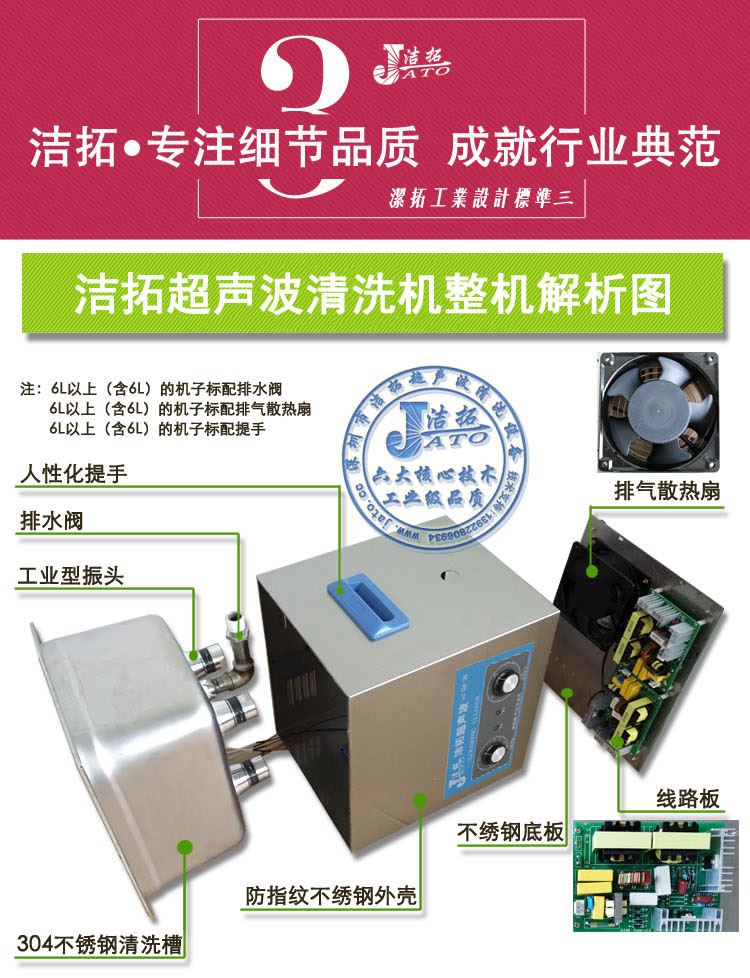 適用于電子,五金,醫(yī) 療,紋身,珠寶首飾,眼鏡,家庭,醫(yī) 院,化工,大專院?蒲袉挝粚(shí)驗(yàn)室,鐘表,航天制造業(yè),汽車制造業(yè),線路板,電腦主板及配件等等。用于生化物理化學(xué)醫(yī) 學(xué)科研及學(xué)校的實(shí)驗(yàn)室中做脫氣,消泡,乳化,混勻,置換,細(xì)胞粉 碎,消毒清洗等。 【五金超聲波清洗機(jī)】產(chǎn)品特點(diǎn)