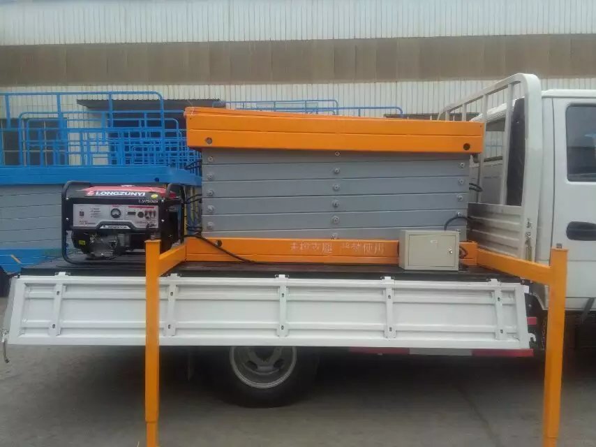 汽車載式液壓升降臺:是由升降臺和汽車配套改裝而成的。它接取汽車引擎動力,實現(xiàn)升降臺的升降功能。適用于大流動量的高空作業(yè)。