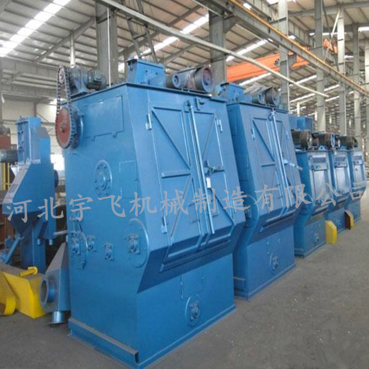 不同規(guī)格的產(chǎn)品被倒入清理室內(nèi),大門關(guān)閉,拋丸器工作,將彈丸(鑄鋼丸或鋼絲切丸)加速拋射至工件表面,對(duì)工件表面進(jìn)行沖擊,刮削以清除產(chǎn)品表面的鐵銹、氧化皮和污物;清理過程中產(chǎn)生的粉 塵由除塵器除去,拋丸結(jié)束后,啟動(dòng)履帶反轉(zhuǎn),將工件自動(dòng)倒進(jìn)產(chǎn)品小車中,從而使工件達(dá)到除銹、去氧化皮的目的。