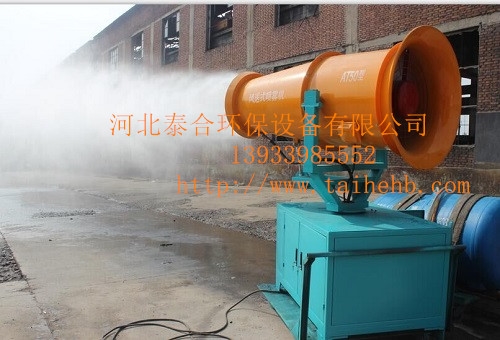泰合生產(chǎn)的高壓遠程霧炮機的工作原理是根據(jù)風(fēng)送原理,將進口高壓泵噴把水將嘴霧化 均勻。在利用風(fēng)機風(fēng)量和風(fēng)壓,把霧化水霧押送至遠距離(粉 塵區(qū)),通過水霧噴灑覆蓋住大面積粉 塵區(qū), 粉 塵遇到水霧凝結(jié)成細小顆粒,由于重力增加,粉 塵隨之跟著降落, 達到降塵凈化空氣污染物降落的目的。